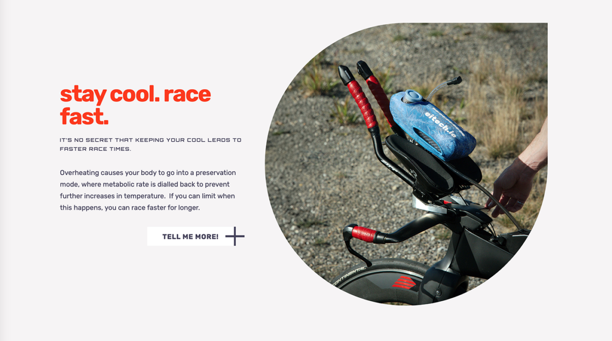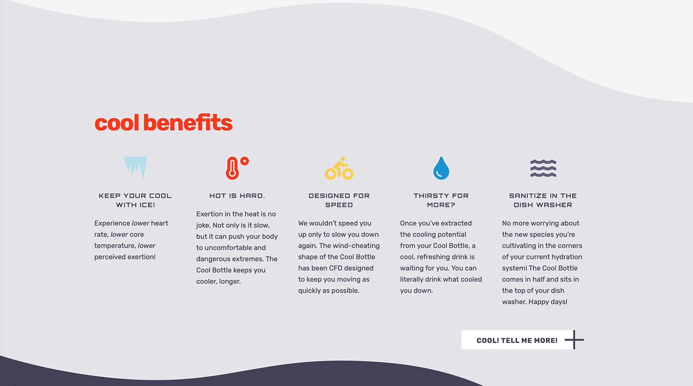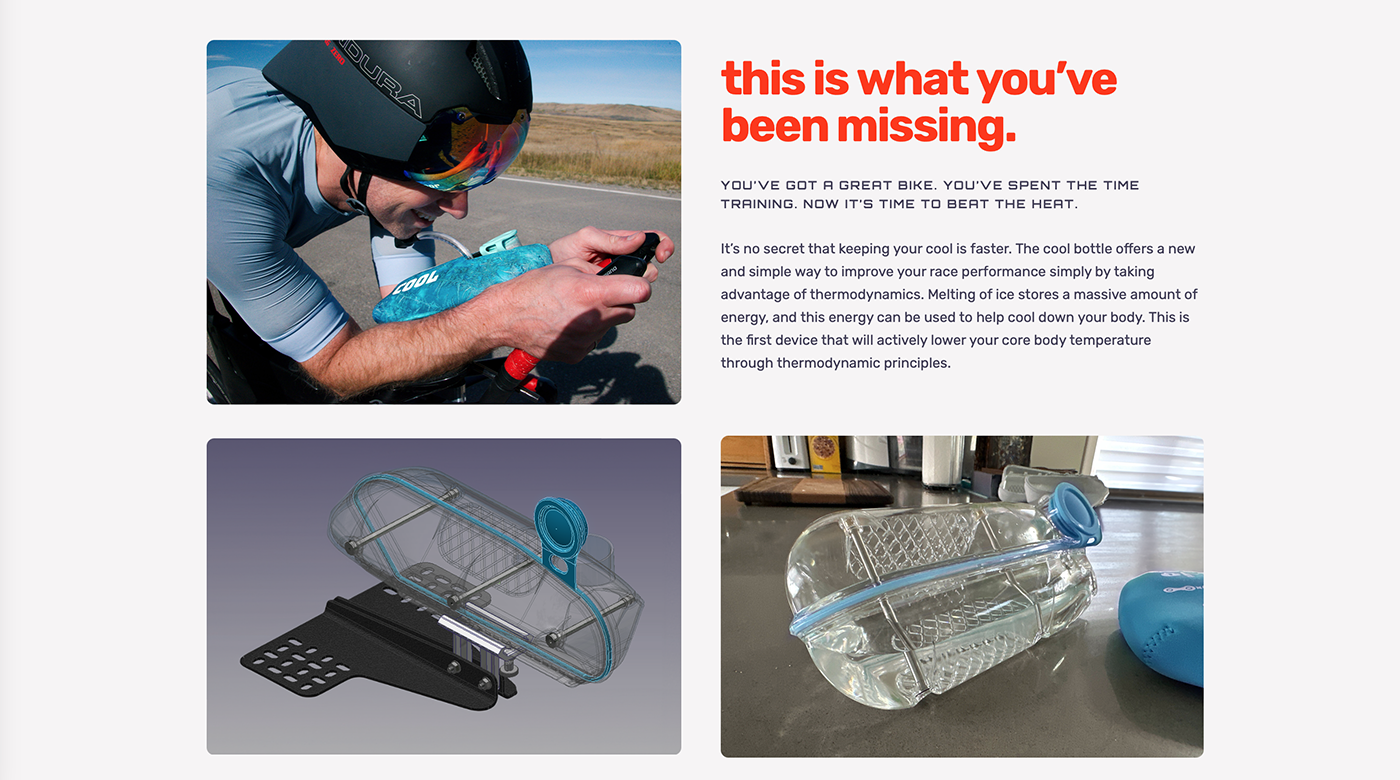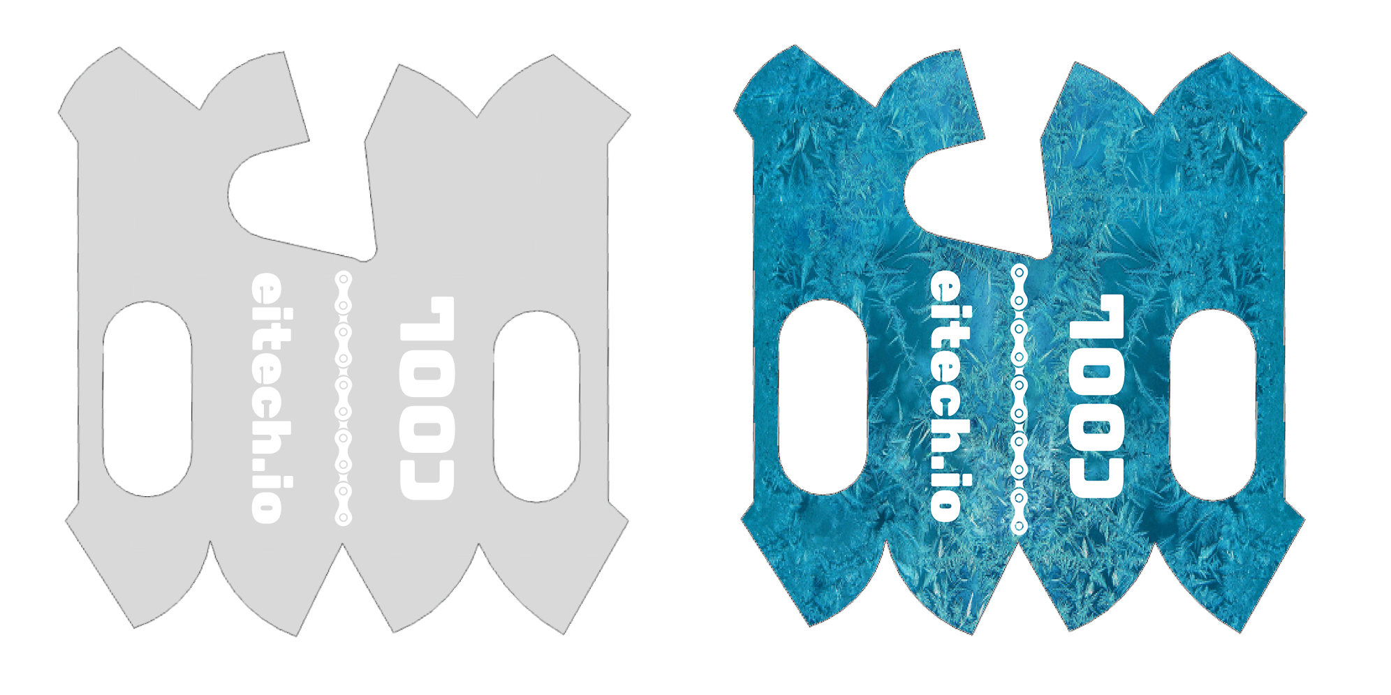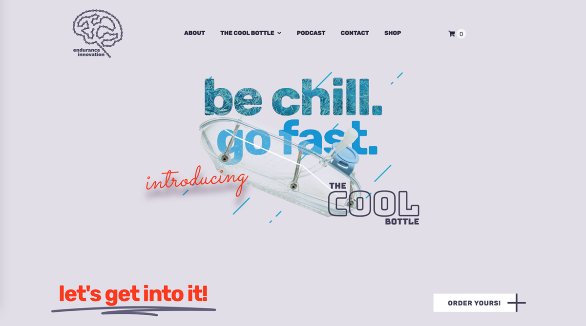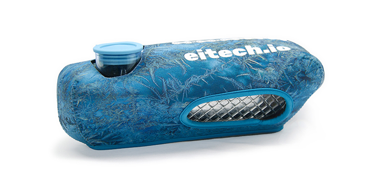 The shape was set, but the EI team need a design that would be easy to read by people looking at the rider using the bottle as well as something visually interesting for the rider themselves to look at. I conceived the idea of using an icy pattern on the bottle cover to give a visual cue to riders that they felt cool (the point of the bottle), whilst also being a subtle backdrop for the text to stand out against.